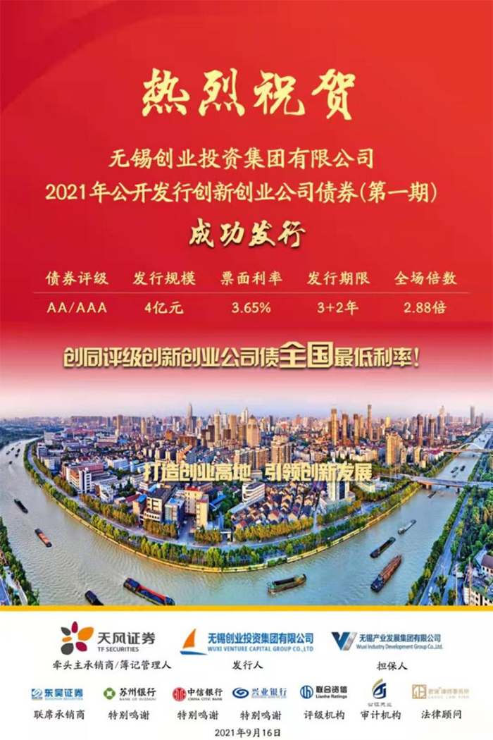 | 利率全國最低!無錫創(chuàng)投集團成功發(fā)行創(chuàng)新創(chuàng)業(yè)公司債券 |