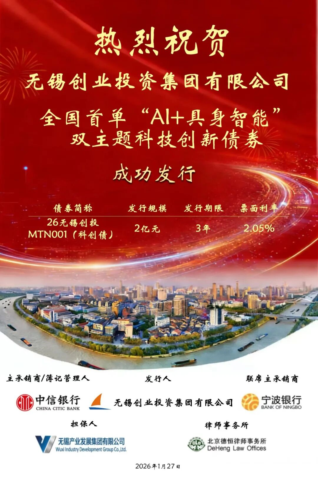 1月27日,全國(guó)首單同時(shí)聚焦“人工智能”與“具身智能”的主題科技創(chuàng)新債券在錫發(fā)行。無(wú)錫創(chuàng)業(yè)投資集團(tuán)有限公司成功發(fā)行2026年第一期中期票據(jù),規(guī)模2億元,集中投向人工智能與具身智能賽道。這是繼去年成功發(fā)行全國(guó)首批科技創(chuàng)新債券后,創(chuàng)投集團(tuán)再次運(yùn)用金融創(chuàng)新工具,精準(zhǔn)引導(dǎo)社會(huì)資本投向科技前沿,為無(wú)錫乃至長(zhǎng)三角地區(qū)關(guān)聯(lián)產(chǎn)業(yè)發(fā)展注入動(dòng)能。